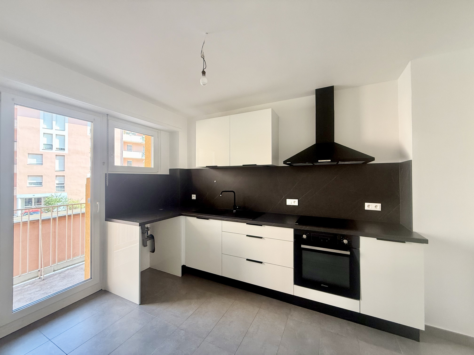 une belle cuisine équipée avec four, plaques de cuisson, hotte, et meubles de rangement, suffisamment grande pour y faire un coin repas et avec un accès direct sur un balcon ;
