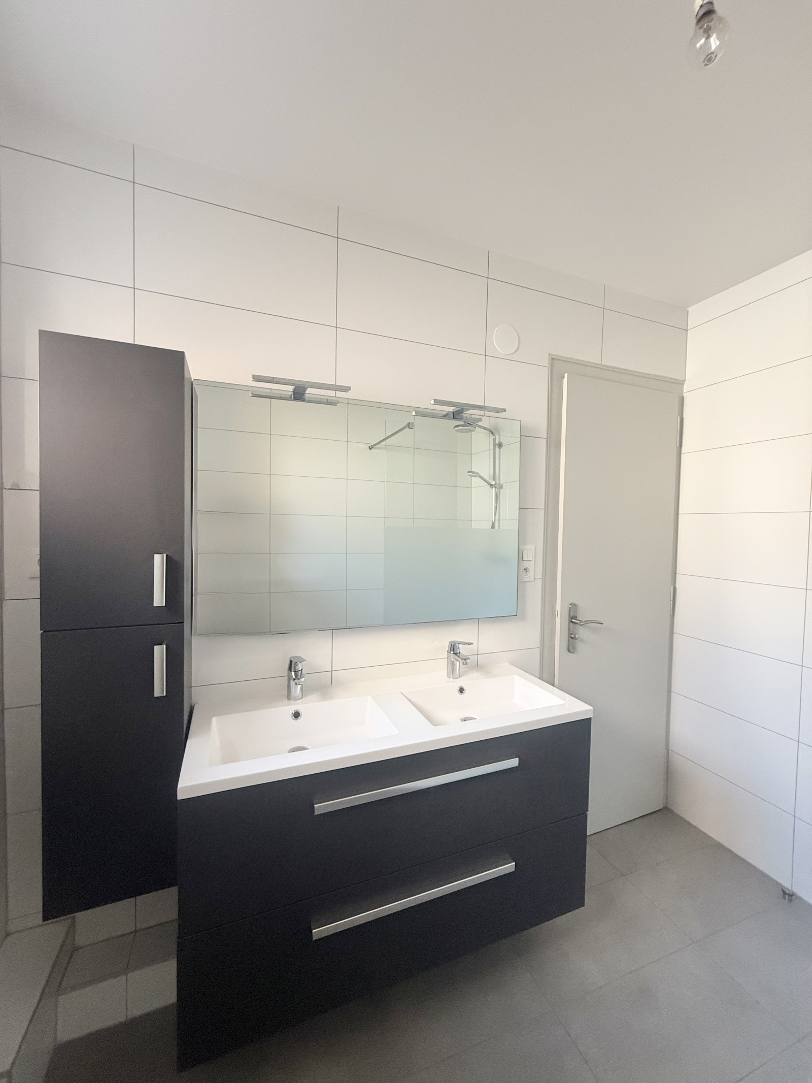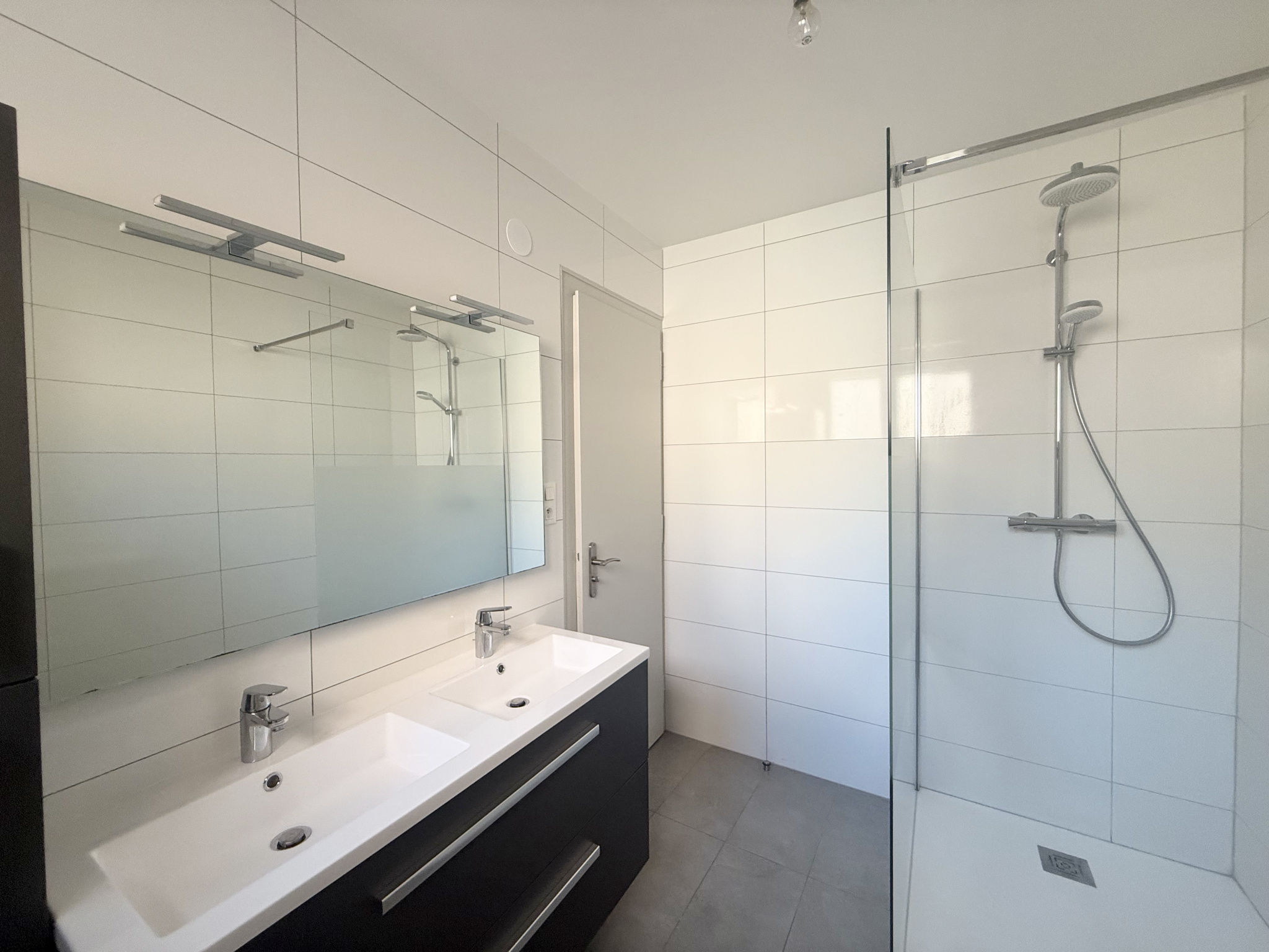une chambre confortable ; une salle d'eau moderne avec douche, double vasque, meubles de rangement et fenêtre ;
