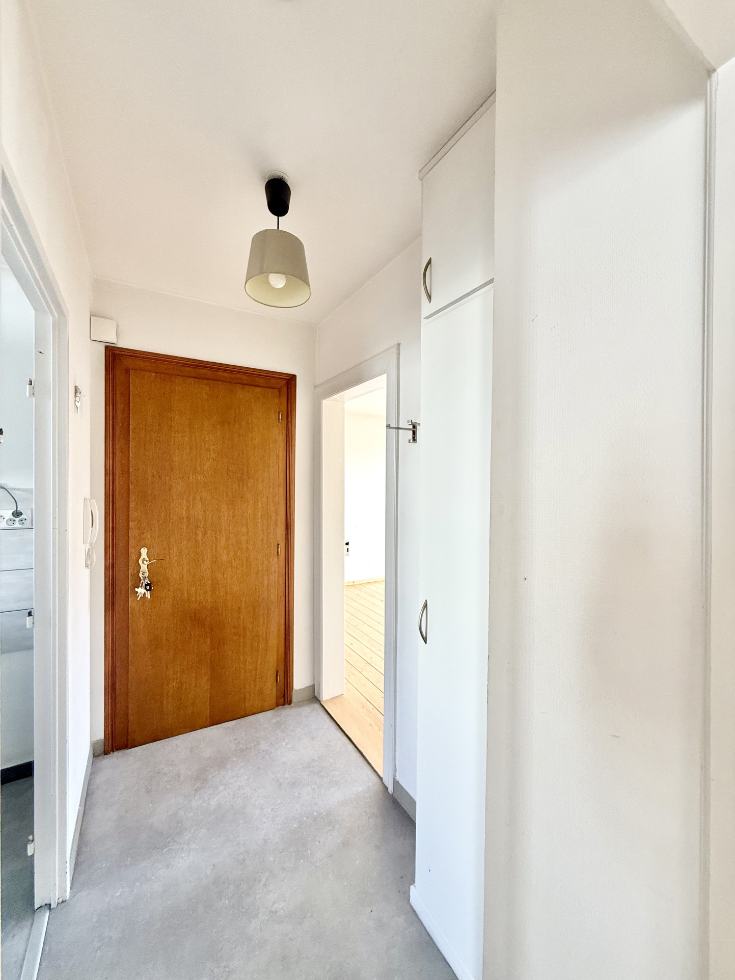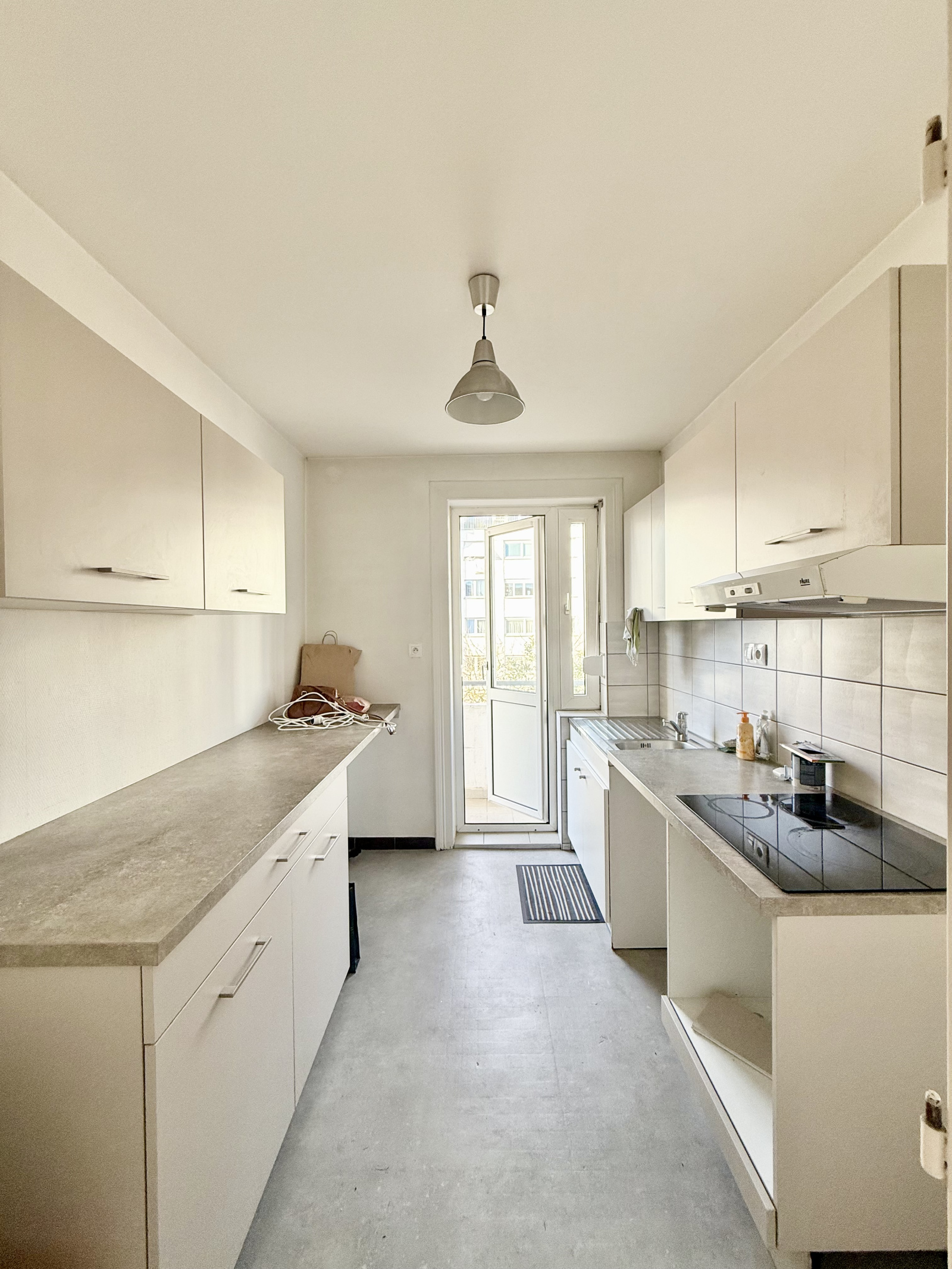une entrée avec un placard, une cuisine équipée (meubles, four, plaque de cuisson, hotte, emplacement lave-linge) donnant accès sur un balcon exposé ouest, un lumineux séjour, une grande chambre, un espace bureau, une salle de douche et un wc séparé.