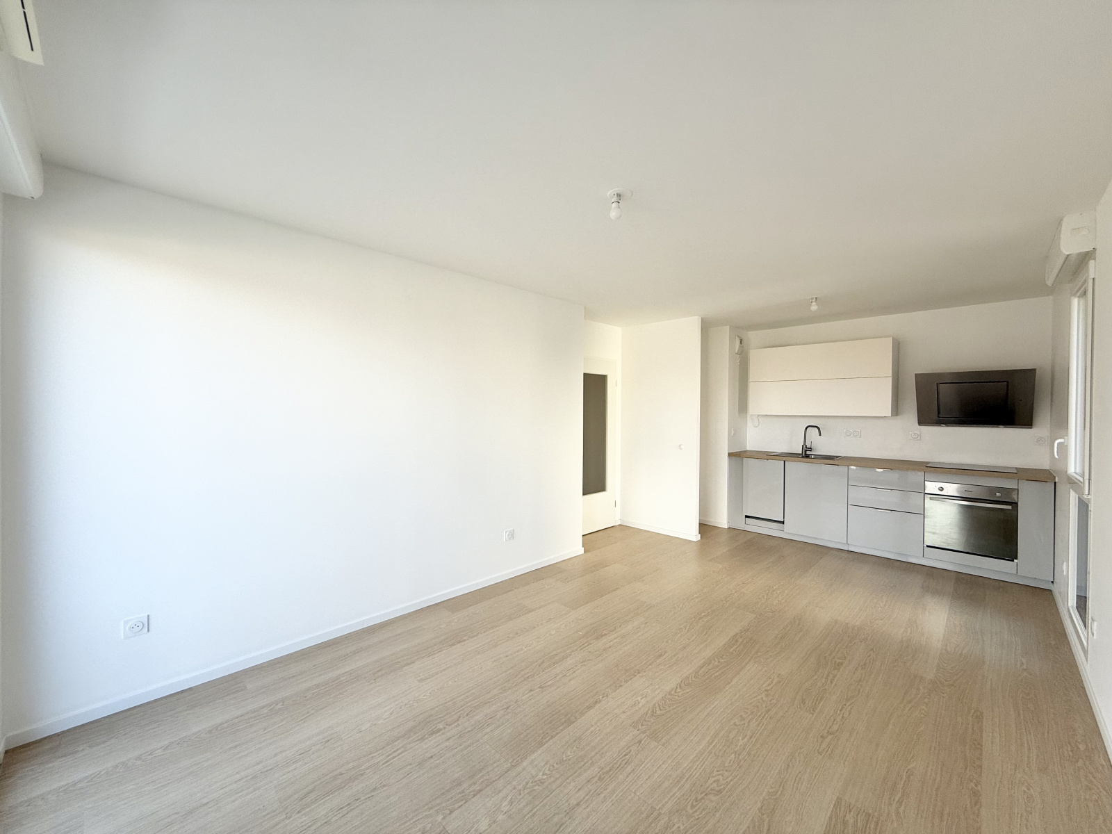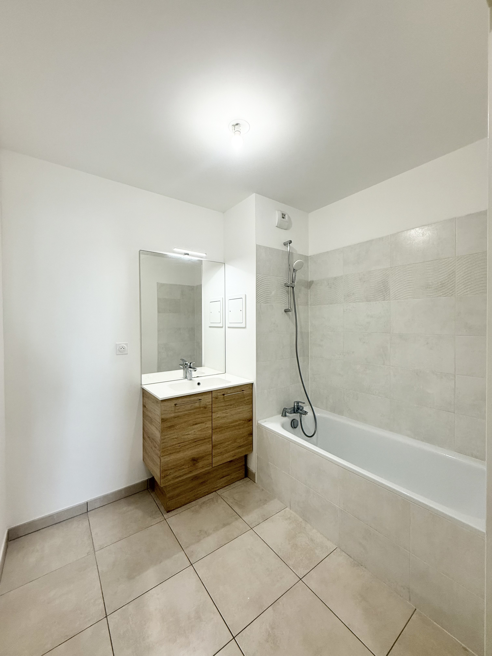 Il se compose de la manière suivante : une entrée avec placard intégré, une belle pièce de vie avec cuisine ouverte entièrement équipée (meubles de rangement, four, plaque à induction, hotte, lave-vaisselle) donnant sur un grand balcon, deux chambres, une salle de bains avec baignoire, meuble vasque et sèche-serviette, et un WC séparé.