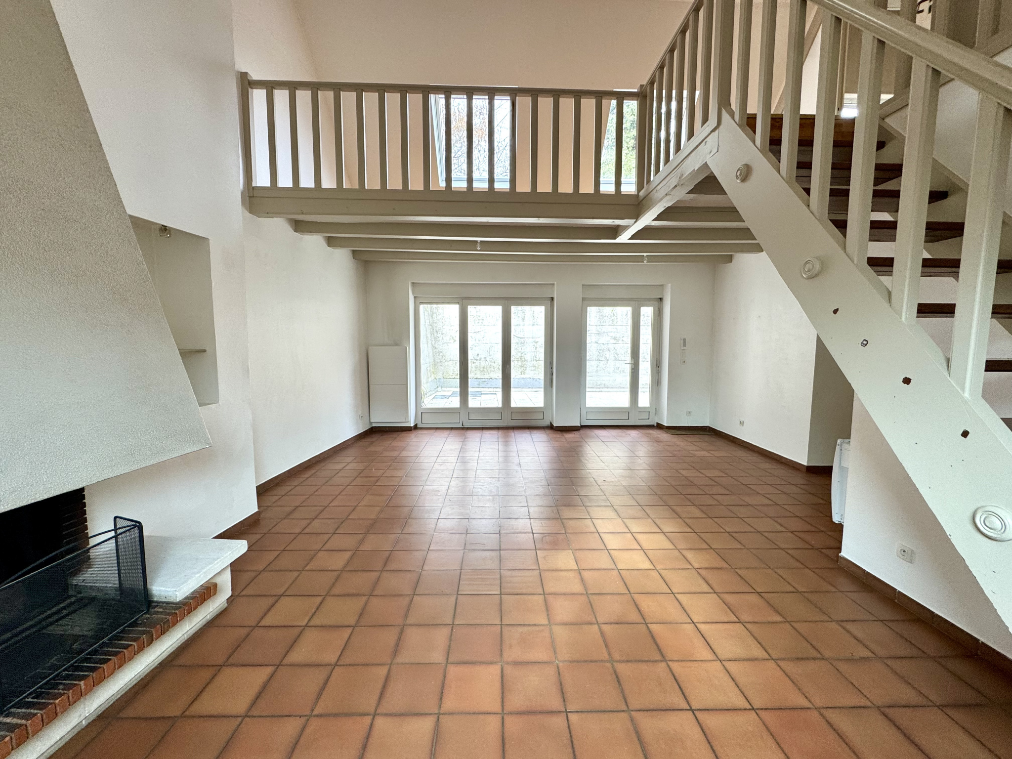 Un escalier mène à une mezzanine pouvant servir de bueau ou d'espace détente surplombant le séjour et desservant une troisième chambre ainsi qu'un cellier avec un lavabo.