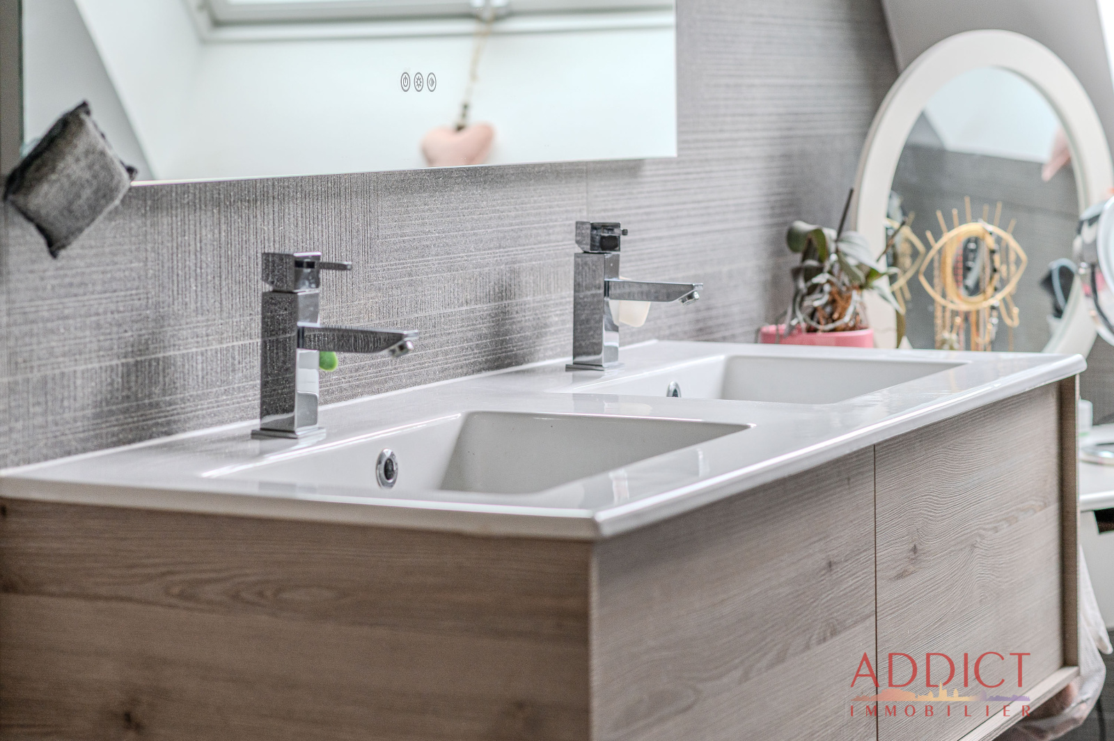Un spacieux et lumineux pallier dessert 3 belles chambres, une salle de bains (une baignoire, une grande douche à l'italienne, un meuble double vasque, un sèche-serviettes et une fenêtre), un débarras et un toilette séparé.
