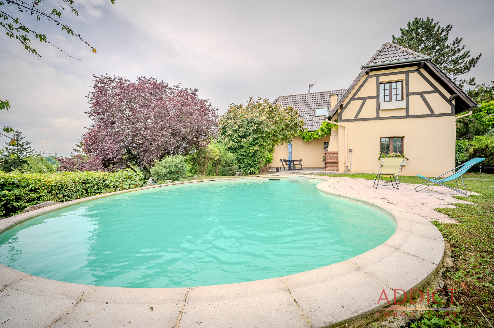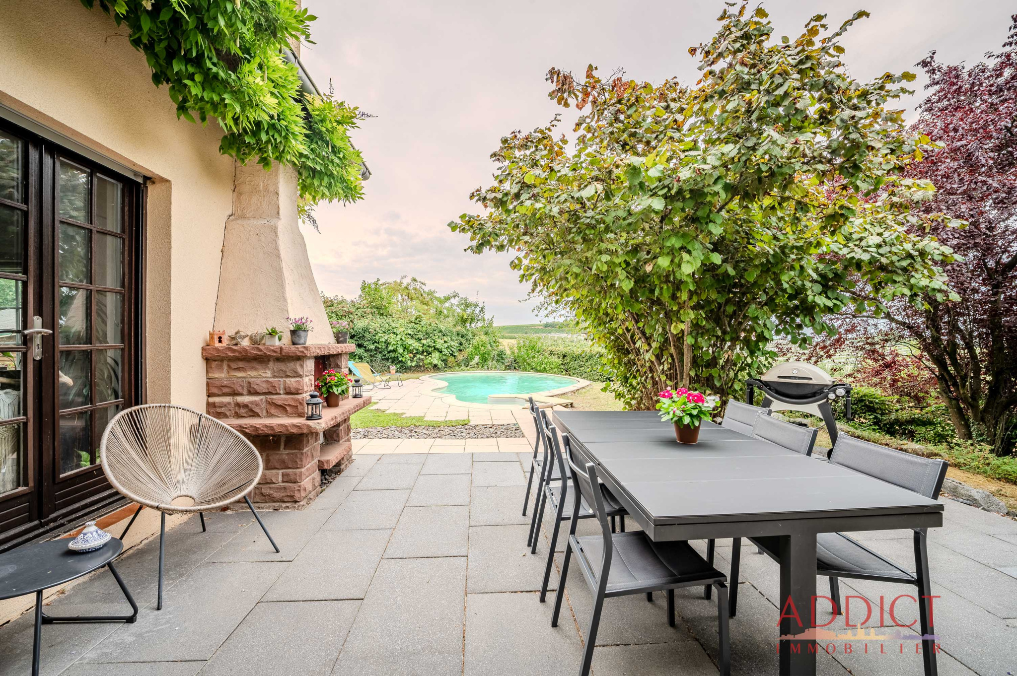 Située dans le village de Kienheim, en hauteur et offrant une vue imprenable sur la plaine, cette maison se distingue par son emplacement paisible, sans vis-à-vis, et son terrain de 7,23 ares agrémenté d'une piscine et d'un bel extérieur parfaitement aménagé.