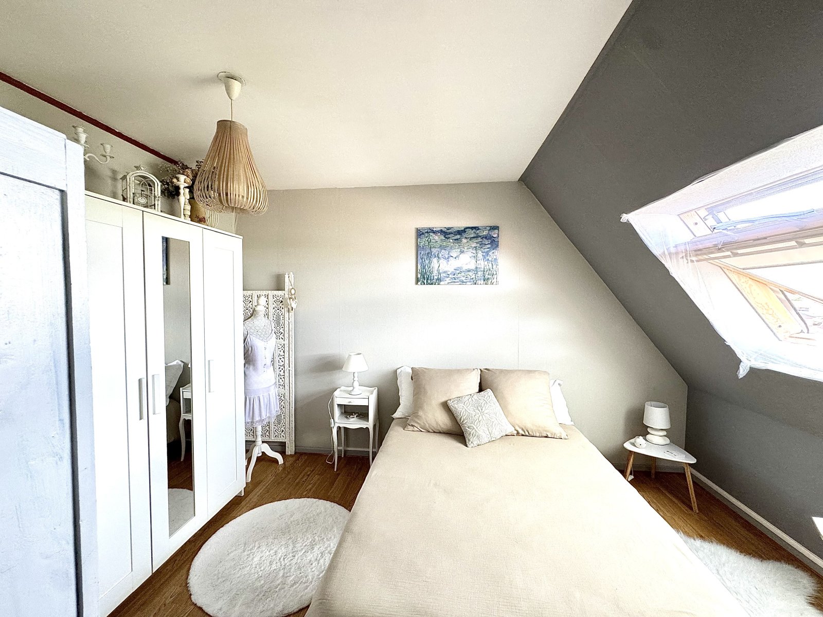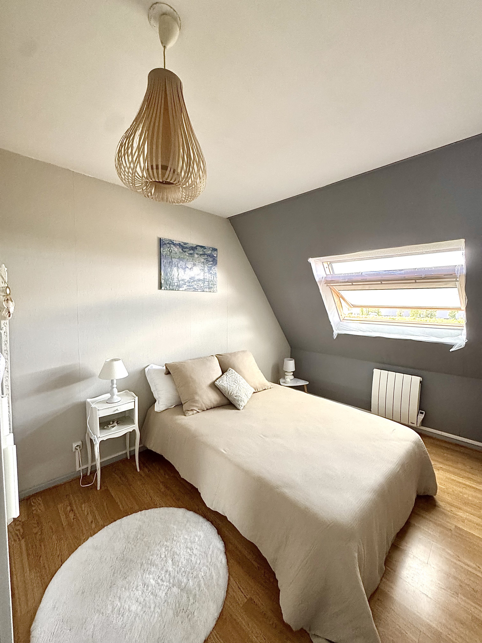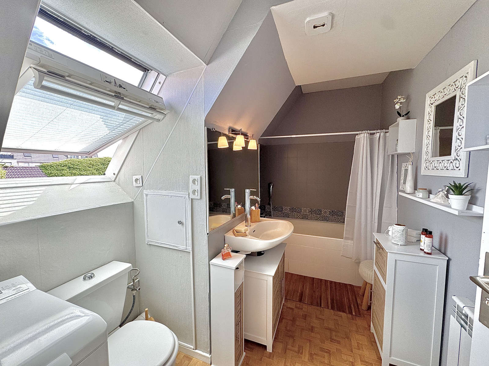Une spacieuse entrée desservant un séjour lumineux, traversant est/ouest, décoré avec goût, une cuisine séparée, une chambre confortable donnant accès à une pièce attenante idéale pour un bureau ou un dressing et une salle de bains avec une baignoire, un meuble-vasque, un WC et un velux.