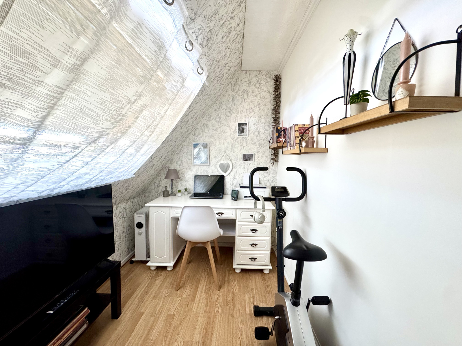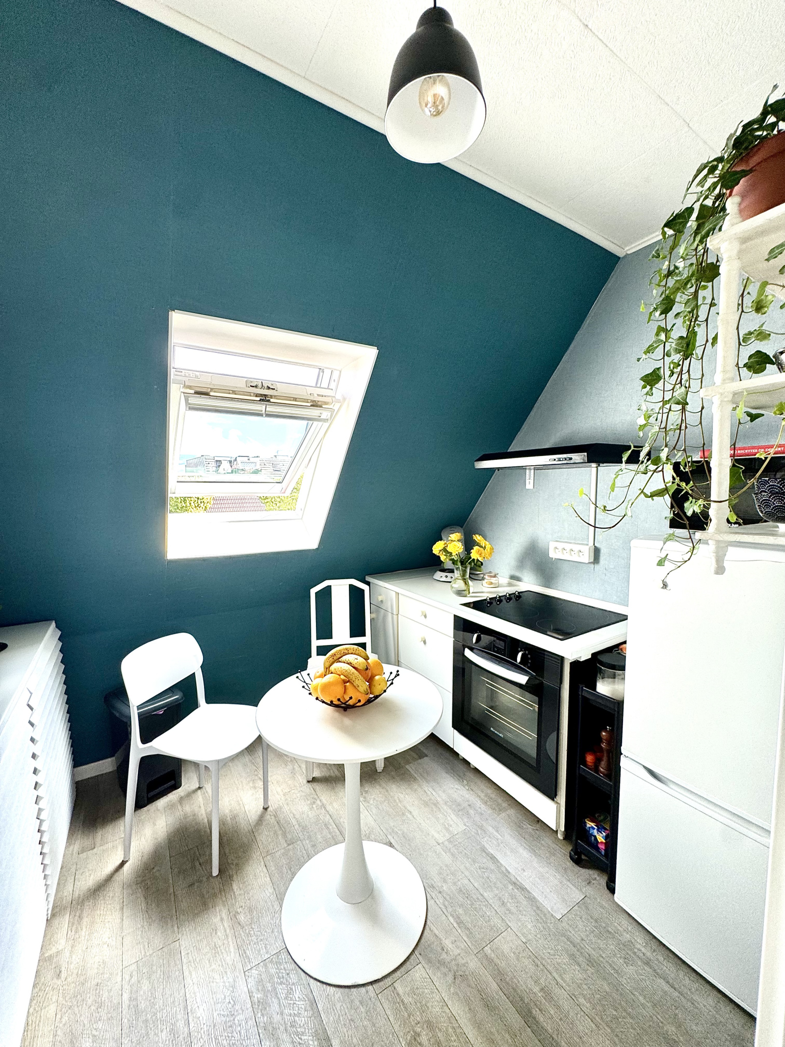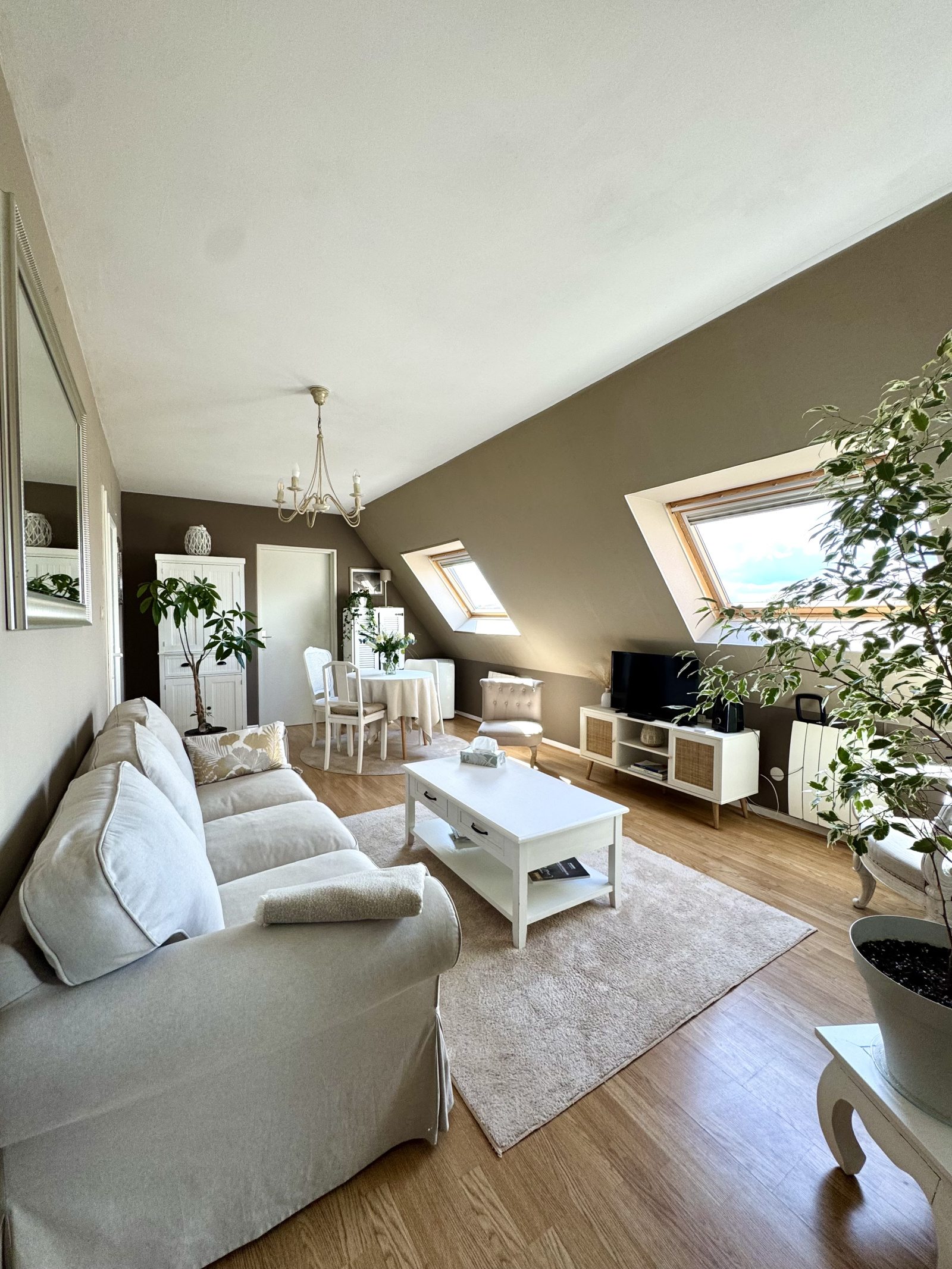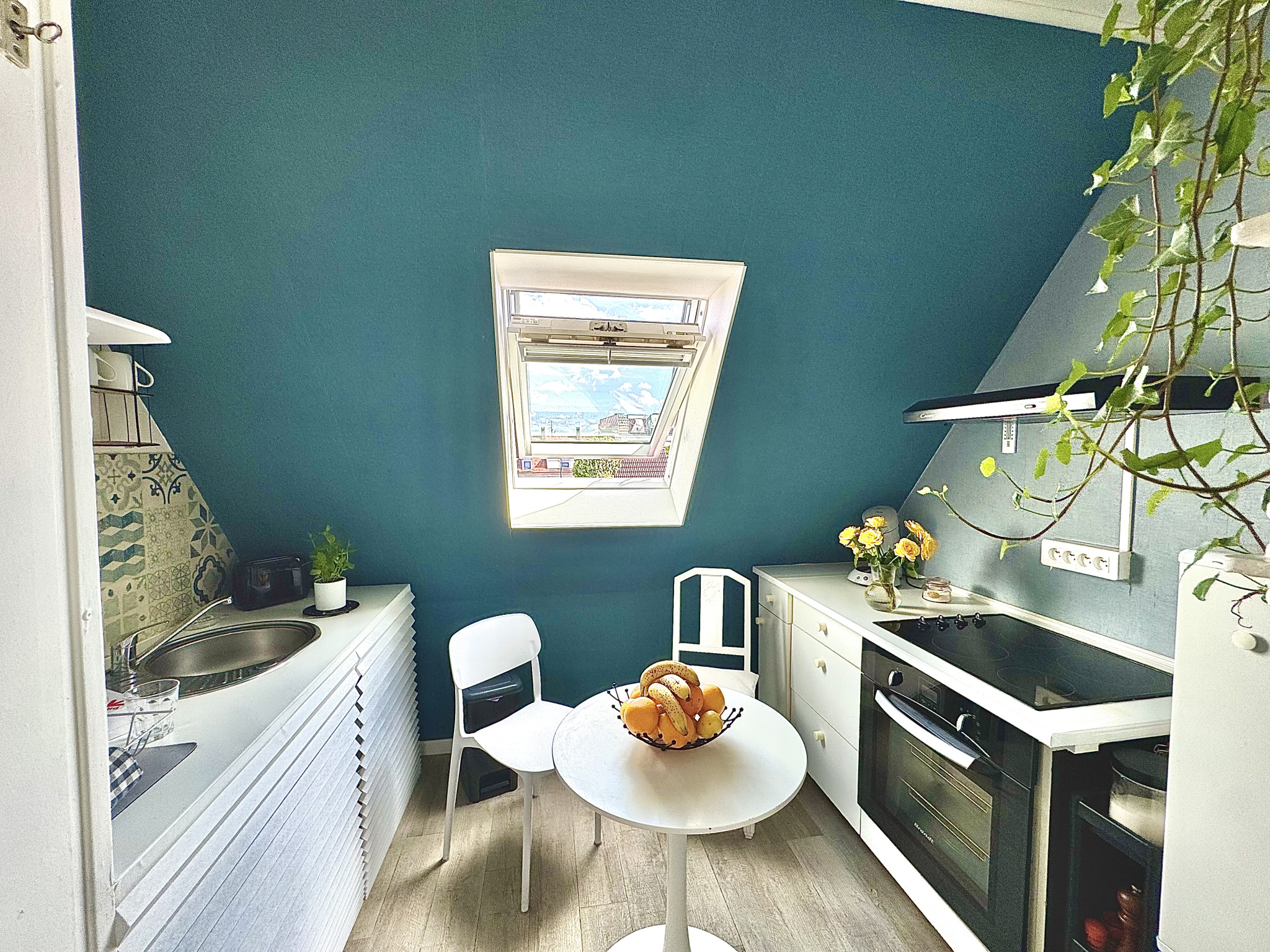 Une spacieuse entrée desservant un séjour lumineux, traversant est/ouest, décoré avec goût, une cuisine séparée, une chambre confortable donnant accès à une pièce attenante idéale pour un bureau ou un dressing et une salle de bains avec une baignoire, un meuble-vasque, un WC et un velux.