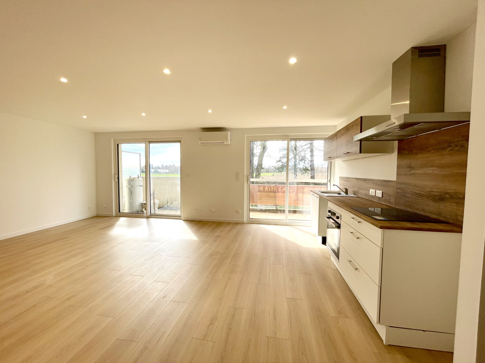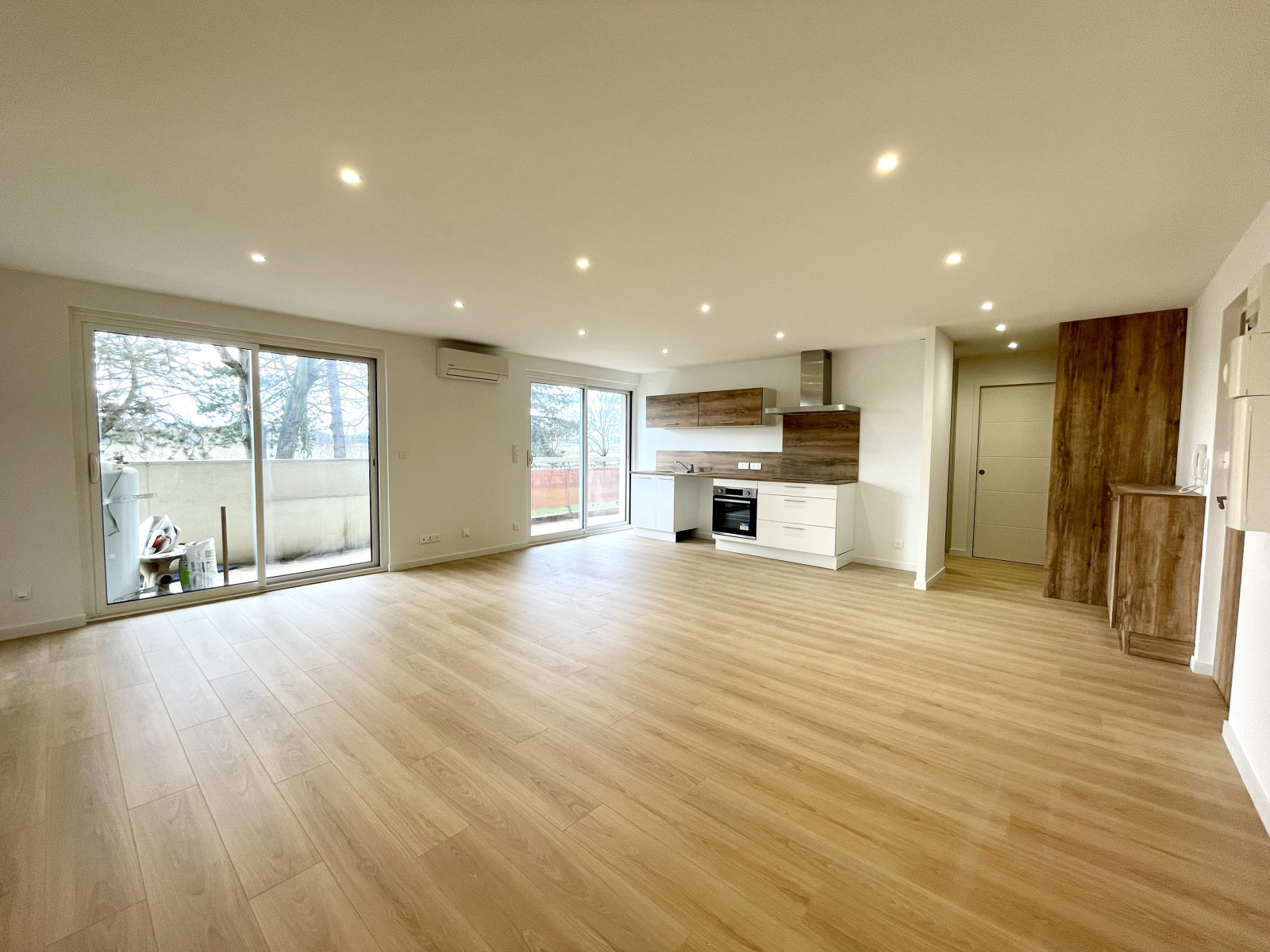 On entre directement dans la pièce principale comprenant le salon séjour et la cuisine équipée neuve, donnant sur la terrasse de 16.35 m² exposée plein sud avec une magnifique vue sur la verdure et le canal, un dégagement avec des placards intégrés nous mène à la salle de douche (une douche à l'italienne, un meuble vasque et un sèche-serviettes), un wc séparé et une chambre.