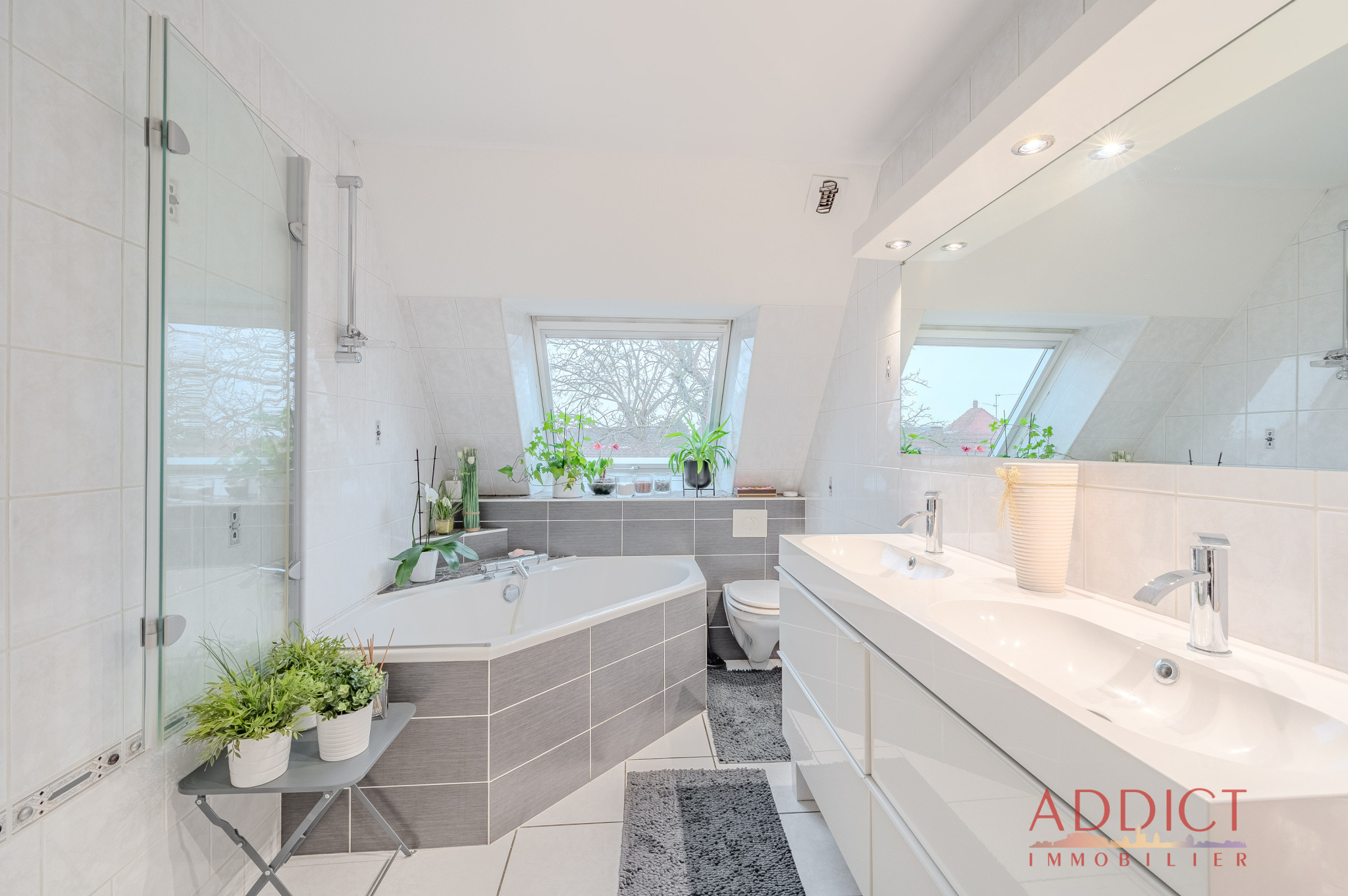 - une grande salle de bains avec baignoire (douche intégrée), meuble vasque et fenêtre,
