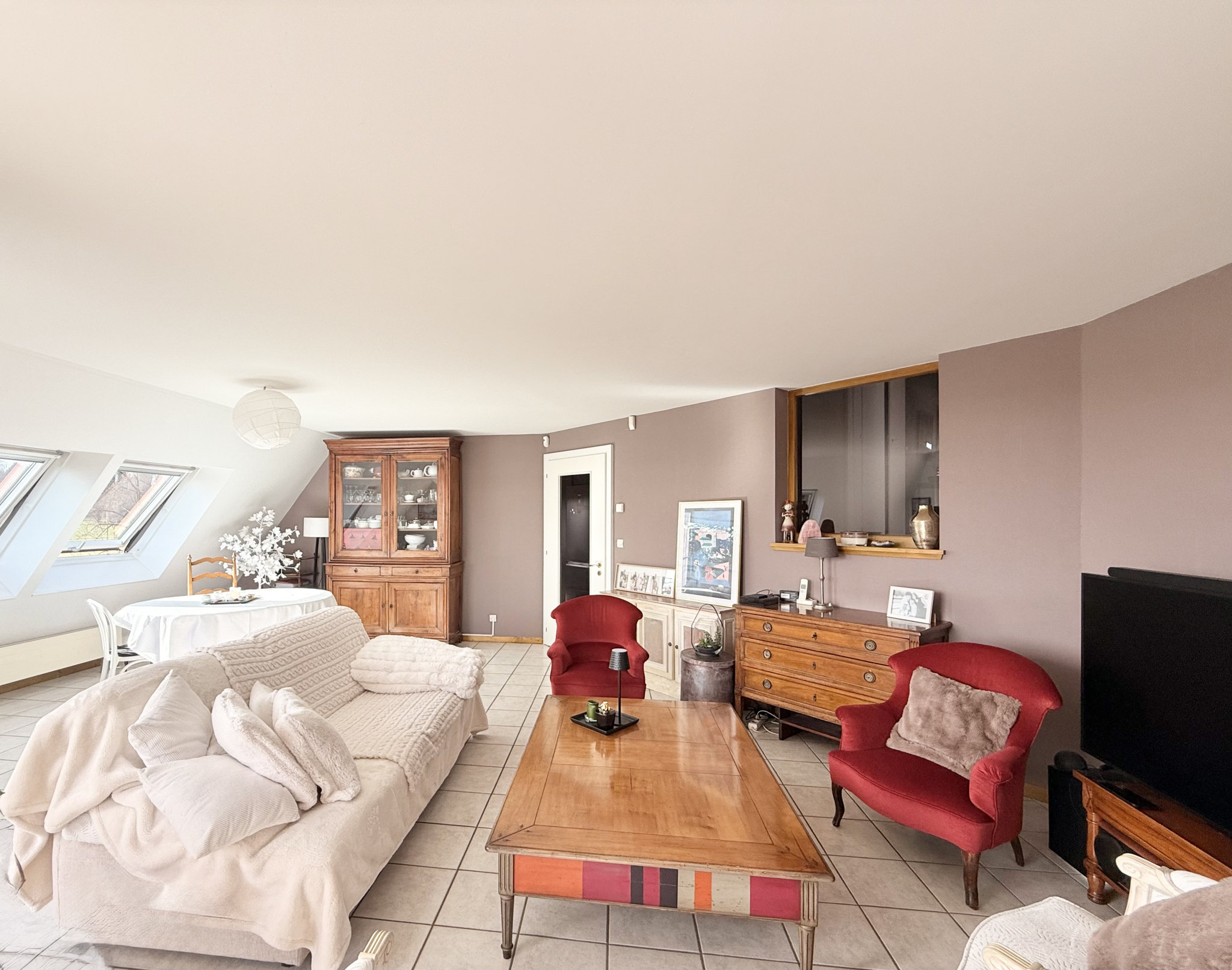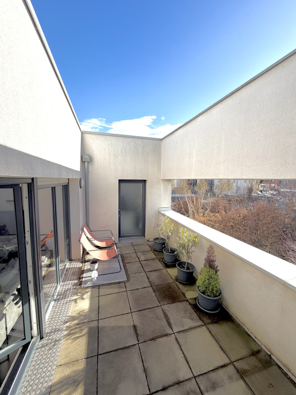 Le salon-séjour de 37 m², particulièrement lumineux, s’ouvre sur une agréable terrasse de 9 m², située à l’arrière de la copropriété, offrant une vue dégagée sur les champs, sans vis-à-vis et au calme absolu.
