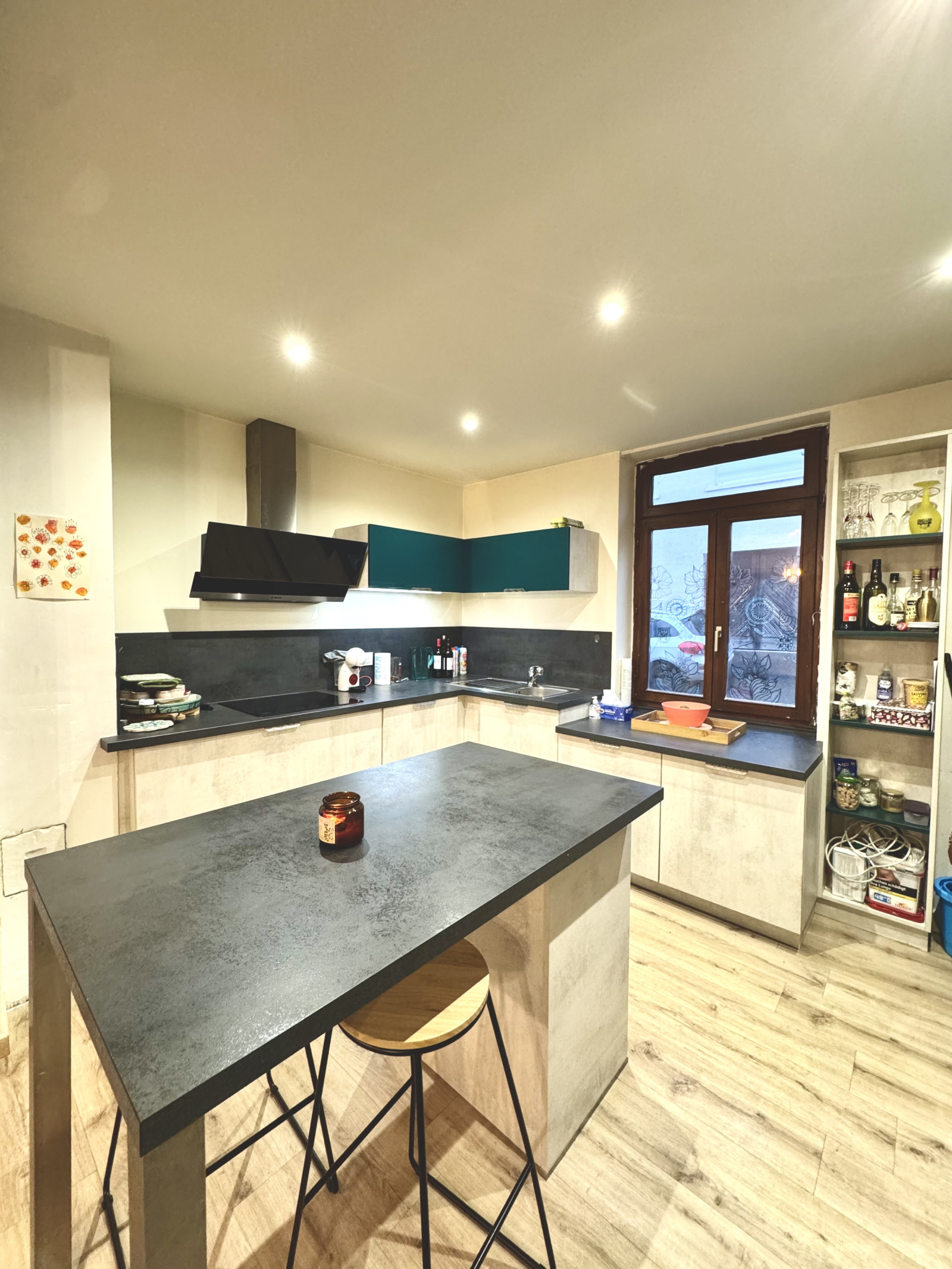 Au Rez-de-chaussée : une entrée, un wc séparé, une cuisine ouverte sur le salon séjour et un accès vers une grande pièce supplémentaire pouvant servir de rangement (20.98m²) ainsi que vers la chaufferie (chaudière à granulés) ou se trouve également la buanderie ainsi que vers la cave.