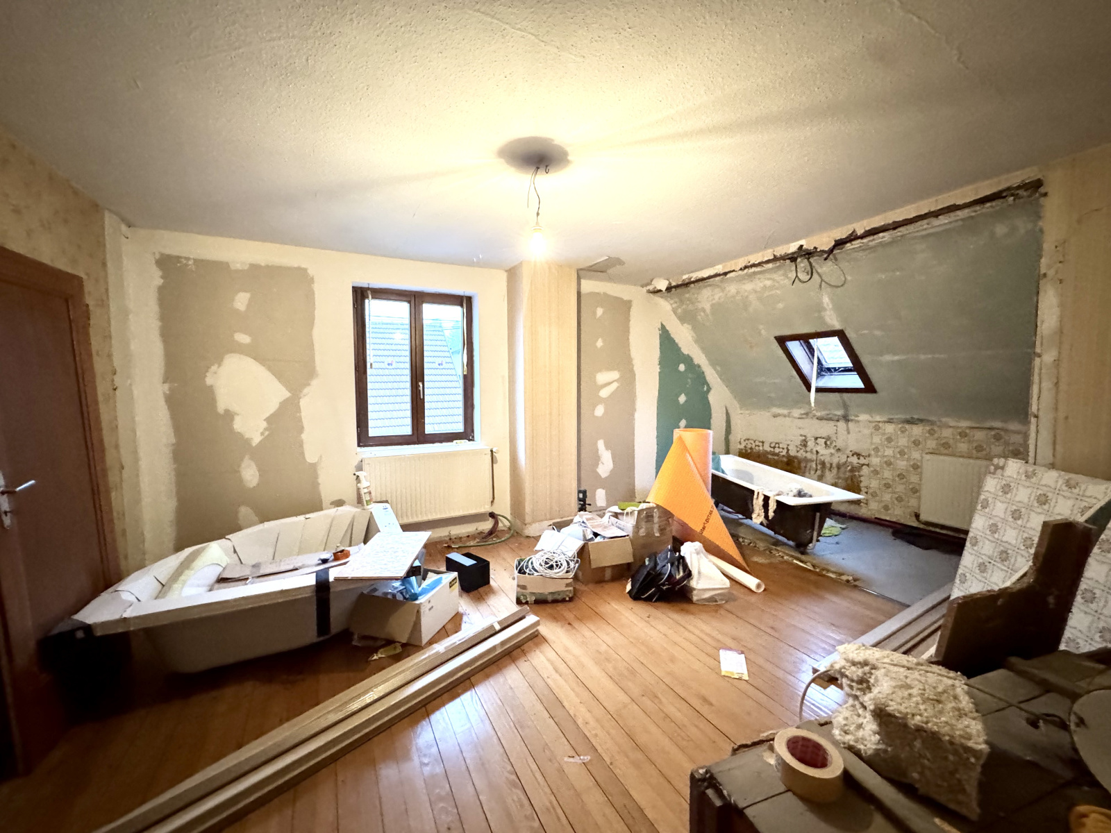 Au 2ème étage : une spacieuse pièce en cours de travaux avec le projet de faire une chambre parental avec une salle de bains privative (les éléments sanitaires sont à disposition) et un espace grenier pouvant servir pour le rangement.