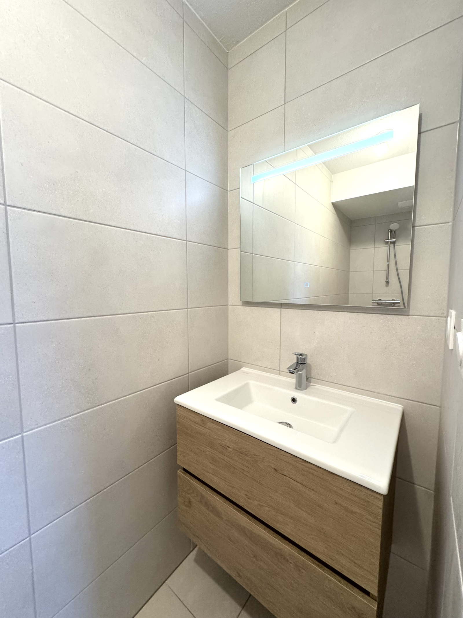 Une entrée desservant la pièce de vie principale avec la cuisine ouverte, le tout donnant sur une belle terrasse de 15.83m² exposée sud ouest, 3 belles chambres, une salle de bains avec une baignoire, un meuble vasque, une fenetre, un seche serviettes, une salle d'eau avec une douche à l'italienne, un meuble vasque et un seche serviettes et un toilette separé.